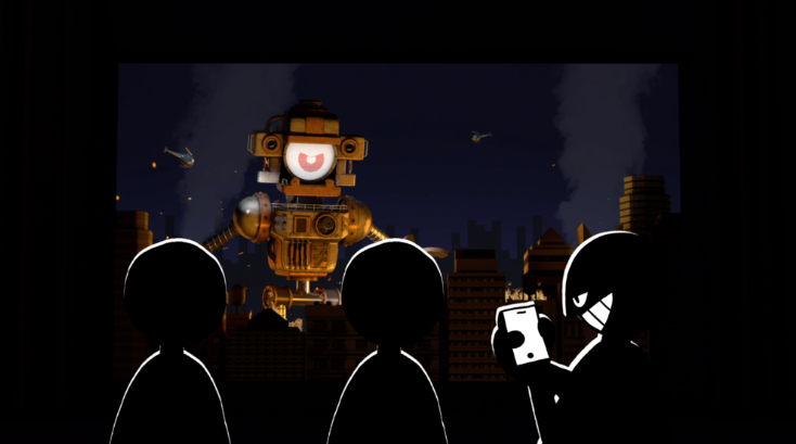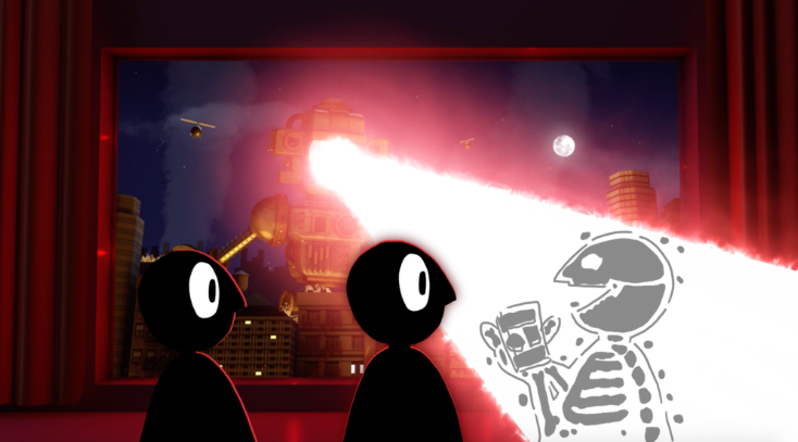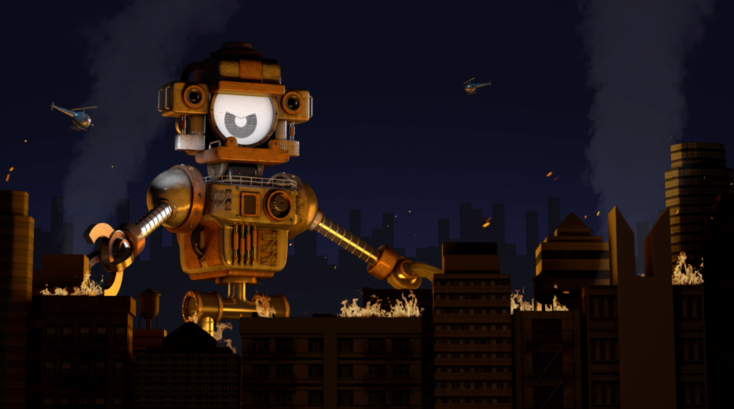 Our second pass of animation was already dramatically different from our previous version. The overall all look and design improved tremendously once we worked out the issues that we had before. The buildings now looked more realistic, and the incorporation of real fire and smoke pushed the new style further. The characters also experienced some modifications. The robot was retextured to have a rustic look and the 2D character in the theater were redesigned to be less abstract.